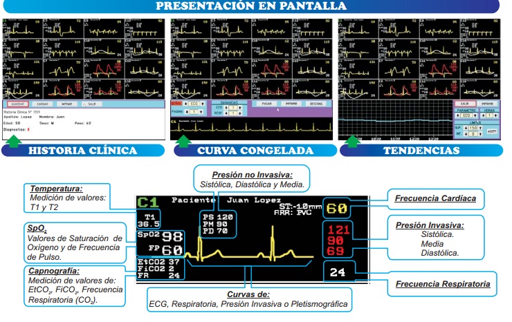 - Impresión de alta resolución de: curvas almacenadas y valores de frecuencia cardíaca; presión sistólica, diastólica y media; frecuencia respiratoria y tendencias de todos los parámetros.