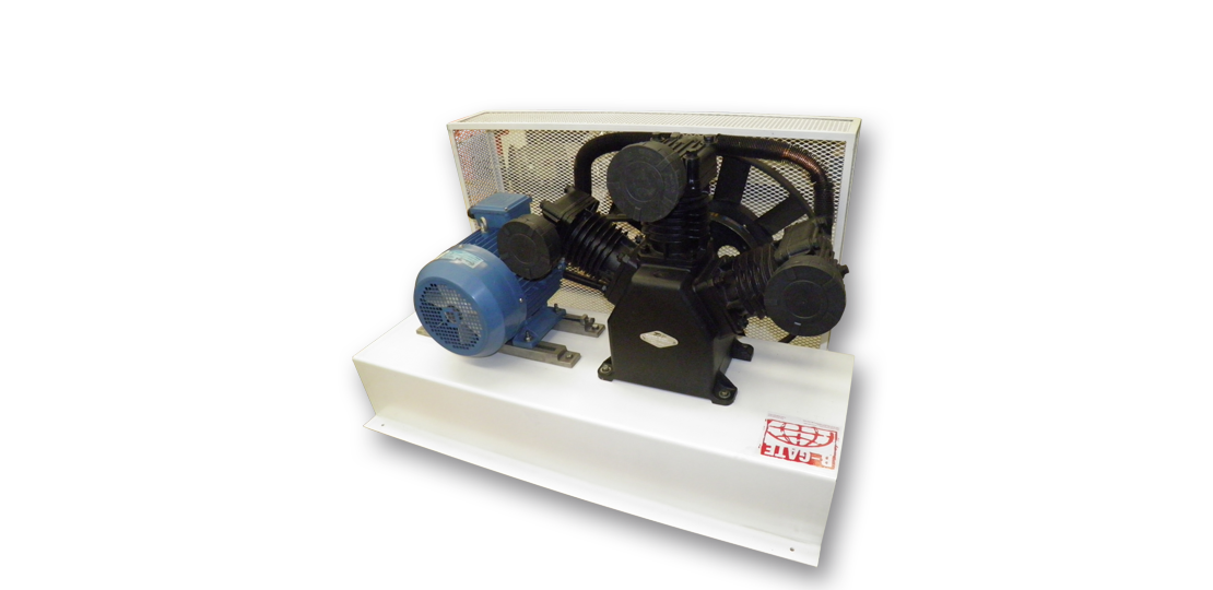 Compresor sobre bastidor con cabezal de compresión 100% libre de aceite, completamente montado sobre rodamientos, presión máxima 100 PSI, caudales desde 200 a 2000 litros/min con motores de aislación IP55 en 1480 RPM, acordes al caudal requerido.
